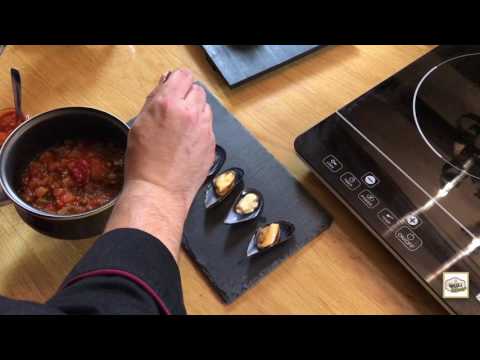 El Chef Rosara explica su receta personal de mejillones alegres, con el punto del Pisto artesanal Rosara y la característica Salsa Brava Rosara libre de tomate.